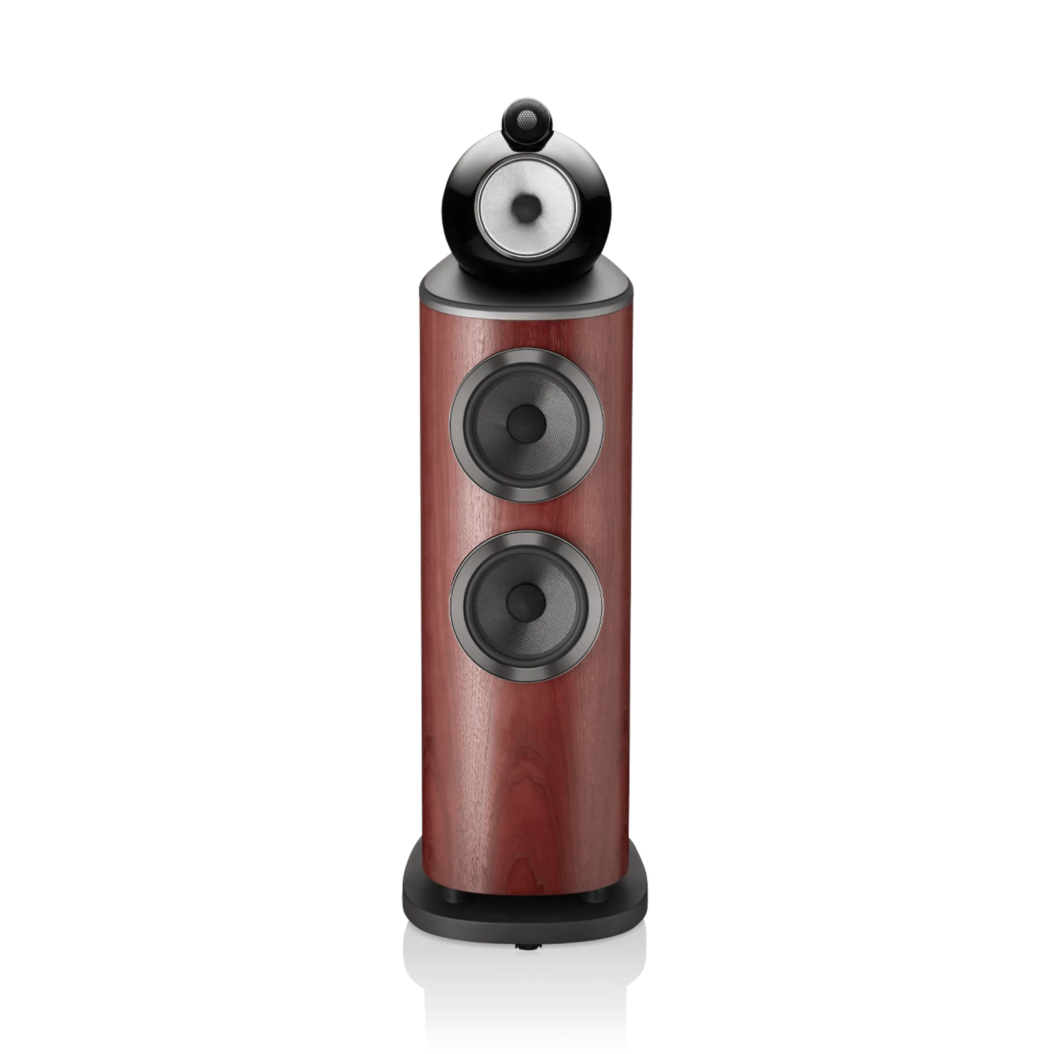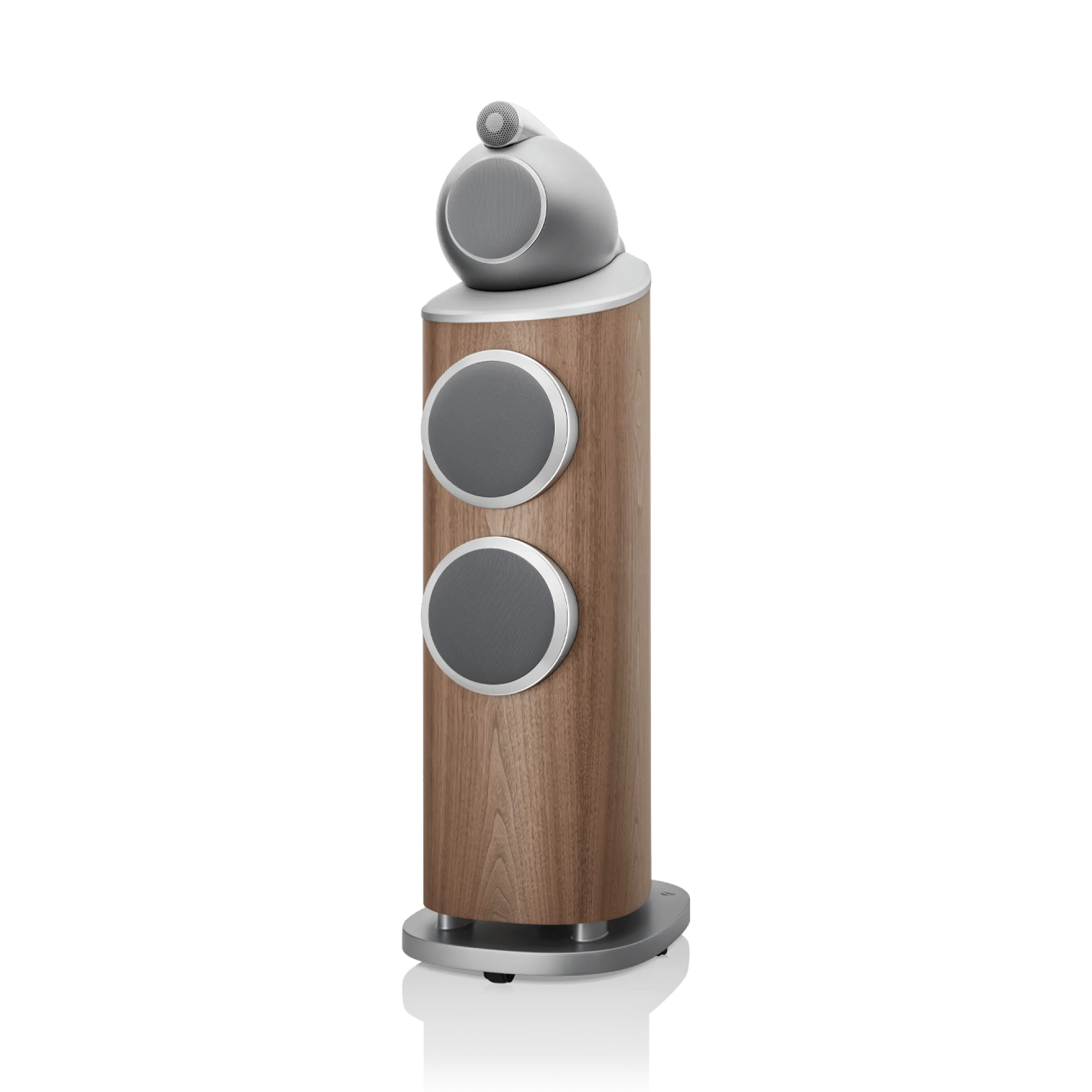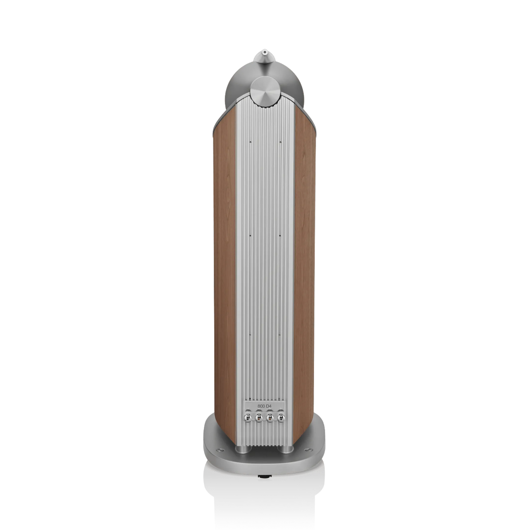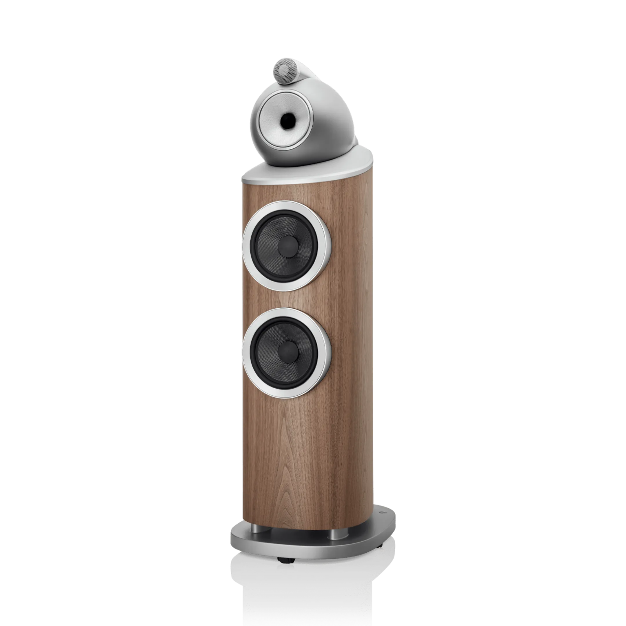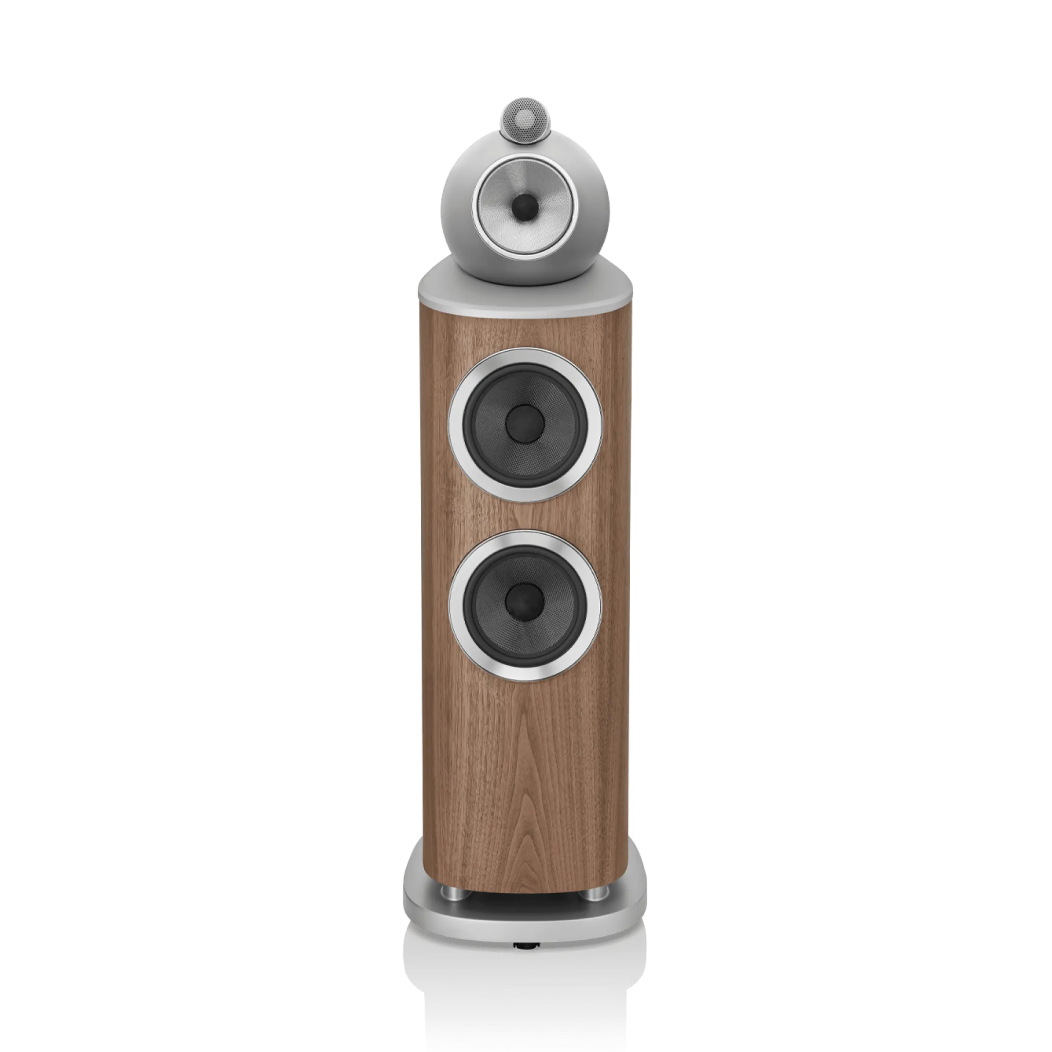 803 D4, iki adet Aerofoil™ bas konisini, her biri kavisli kabinin en sert kısmına sabitlenmiş bir alüminyum plakaya kenetlenen ikiz, yekpare alüminyum bas kapsüllerine monte eder. Tek parça metal olarak şekillendirilen bu sert yapılar, o güçlü bas konileri için mükemmel mekanik konumu sağlar.